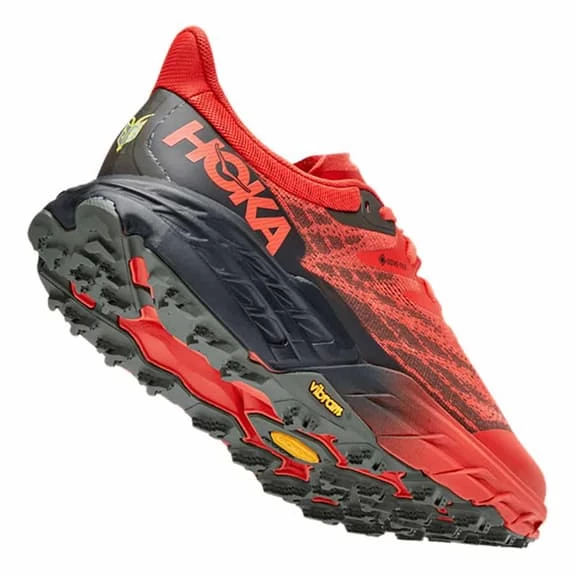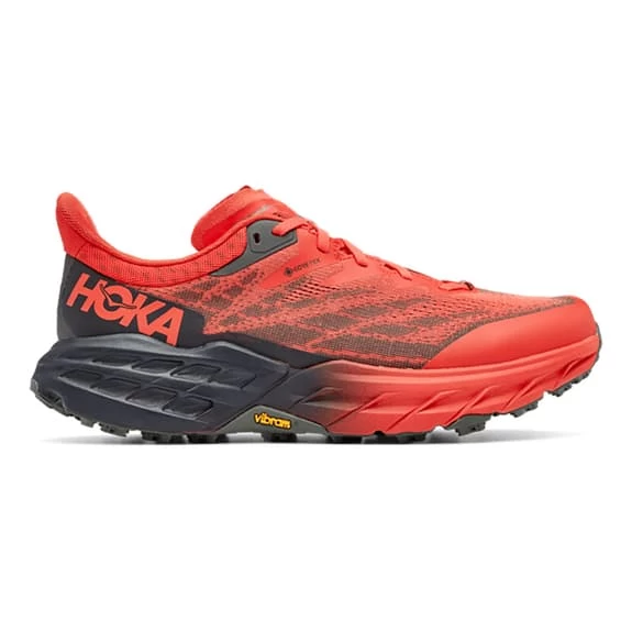 The HOKA Speedgoat 5 GORE-TEX shoes are designed for technical trails. This trail shoe has been updated with Vibram Megagrip technology with traction cleat for improved grip and stopping power on loose terrain. The midsole compound, even lighter than before, provides Hoka’s signature soft underfoot feel without reducing heel height. It is also combined with a double-layered jacquard mesh.