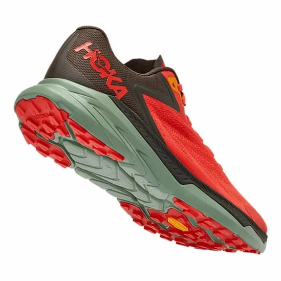The HOKA Zinal are a blend of speed and agility, a responsive shoe for technical terrain. Attack technical terrain with confidence and grip with this Zinal model. Designed for shorter distances, this agile model offers the perfect combination of speed and agility. Made from recycled yarn, a stripped mesh upper has been designed with a reinforced tongue to hold debris. Featuring a dual-density Profly midsole with ultra-lightweight foam on the upper and EVA rubberised EVA on the bottom, the Zinal is finished with a Vibram Litebase outsole.